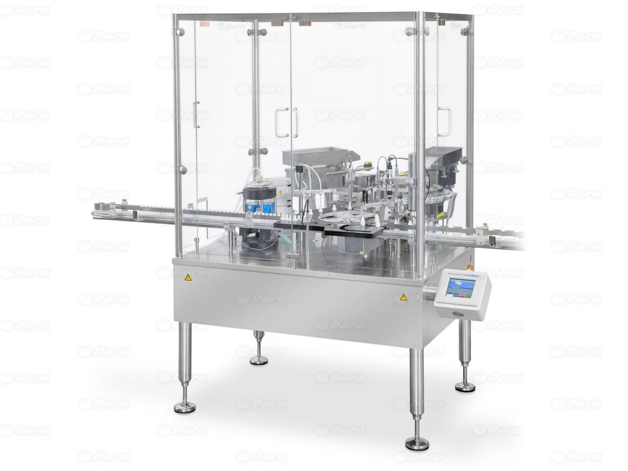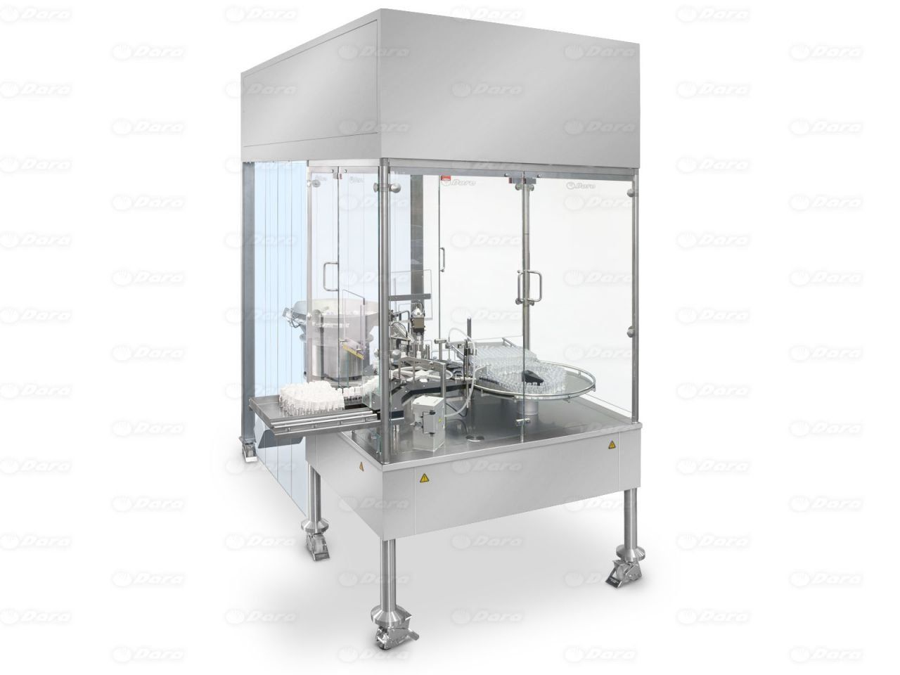 The equipment is for automatic filling, closing and labelling of vials and bottles in glass, plastic, or metal, in sterile areas or clean rooms.
